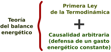 ¿Es contrario este modelo a las leyes de la física? No. Lo que viola y suplanta este modelo es la fisiología, no la física. O, en otras palabras, el problema que tiene la teoría del balance energético es que no es, como se presume, sólamente la encarnación directa de las leyes de la física: implícitamente se asume que las oscilaciones en la ingesta energética causan diferencias entre lo que se ingiere y se gasta, y esto se consigue jugando las palabras y haciendo parecer que el gasto energético es independiente de la ingesta (ver). Es decir, una de las trampas del modelo es que la física viene acompañada de un comportamiento ilegítimo, una causalidad, que podríamos interpretar como que nuestro cuerpo defiende un gasto energético estable/constante. Como consecuencia de esa arbitraria —i.e. injustificada— presunción se llega a la fraudulenta conclusión de que las fluctuaciones en la energía ingerida causan la acumulación de energía (ver,ver).