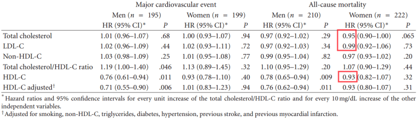 los niveles de colesterol total, LDL-C y no-HDL-C no tuvieron un impacto significativo en la prognosis a largo plazo de ninguno de los dos sexos