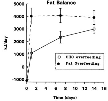 - [SG 1h3m] I want to talk about studies where they increase calorie intake. If we want to understand why people get fat, we can look at studies that overfed people on fat or carbohydrates exclusively. In one study they calculated the energy requirements and then they increased that by 50% with fat or carbohydrate. This is Horton’s study, reference [16]
