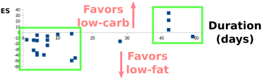 We have also seen that meta-analysis in the blog (see). As we have just seen, the effect of a diet changes over time, so I represented the duration of the experiments with the effect on body fat. As we see in the following graph, most of the experiments included in the meta-analysis are less than two weeks long, practically all of them reporting less accumulation of body fat with the diets that have more carbohydrates and less fat: