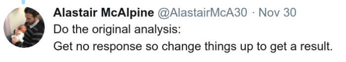 Is that true? According to David Ludwig (see), the protocol of the experiment was unusually detailed (unlike other experiments, in which the authors don’t give many details and then they do whatever they fancy) and was incorrectly stated. As the experiment progressed, they were fixing mistakes. And, when they realized that the measure of the energy expenditure was wrongly specified: they fixed the mistake. This happened BEFORE BREAKING THE BLIND in the experiment. I say this again: they fixed the mistake before breaking the blind.