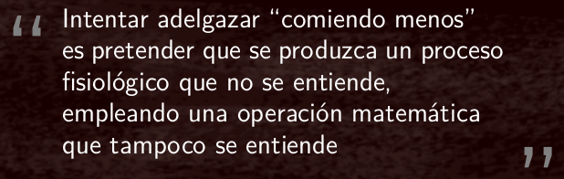 Cuando un mecánico te dice que tu coche funcionaría mejor con fanta naranja que con gasolina, no se lo discutes, porque él es el que sabe de coches. Y cuando una nutricionista dice que la obesidad se previene o se trata con una resta, no se lo discutes, porque ella es la que sabe de fisiología, de física y de matemáticas.