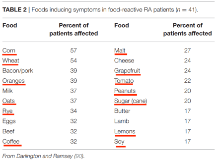 Tabla 2 del artículo: productos alimentarios que provocan síntomas en personas que padecen artritis reumatoide. He señalado en rojo todos los productos de origen animal, que son los más problemáticos. En particular el maíz y el trigo destacan claramente, pues más de la mitad de los participantes del estudio reportaron problemas con esos productos de origen animal.