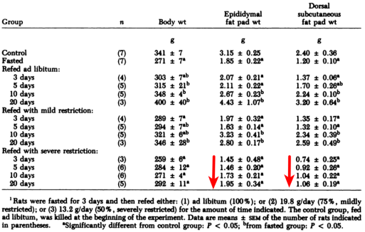 Me voy a fijar únicamente en el grupo con la ingesta limitada al 50% del ad-libitum. ¿Qué sucede con su grasa corporal? Repito: esas ratas han estado 3 días si comer y a continuación siguen con restricción calórica, pero comiendo algo. El resultado es el que vemos remarcado con una flecha roja en la tabla: la grasa corporal de esas ratas está aumentando con el paso de los días.