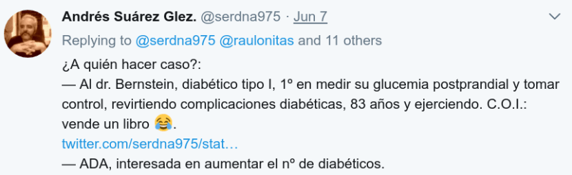 Te preguntas si debe consumir fruta y otros carbohidratos. Lees en internet y encuentras la opinión de un «experto» (ver) que afirma tajantemente que tu hija sí debe consumir fruta, porque en una búsqueda rápida en pubmed ha encontrado un experimento de 3 meses de duración en el que no se perciben diferencias entre las dos dietas empleadas, ambas muy altas en carbohidratos. Un experimento de tres meses, ¿te puede dar las claves para la salud a largo plazo de tu hija? Estudio de duración ridícula en enfermedades cuyas complicaciones se manifiestan al cabo de años, sin ni siquiera comparar con una dieta baja en carbohidratos, en pacientes recién diagnosticados de diabetes tipo 2 (menos de un mes desde el diagnóstico, en término medio), ningún participante con diabetes tipo 1, con una diferencia mínima en azúcares procedentes de la fruta (ver), etc. tienes claro que ese estudio es, literalmente, una mierda, y que no puedes apostar la salud de tu hija de forma irresponsable con ese estudio como respaldo. Los autores del experimento han comprobado que no hacer nada en la dieta durante muy poco tiempo apenas tiene efecto en marcadores de salud. No te basta. No te puede bastar. Por suerte has hojeado el estudio y no te has quedado con la opinión del «experto».