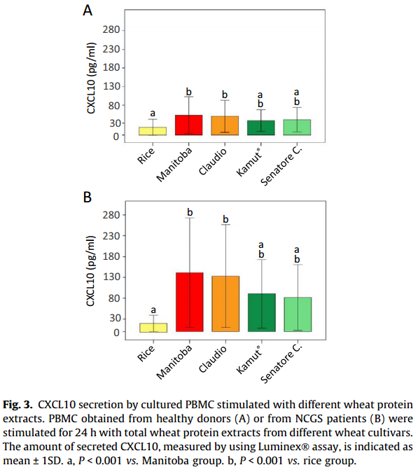 «the levels of CXCL10 secretion under stimulation by gluten-containing flours were significantly higher in NCGS patients for all four grains tested»