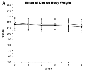 even though we attempted to keep the participants’ body weight stable, the participants lost a mean of 4 lb while ingesting both diets […] the average body weight decreased by 4 lb (1.8 kg) during the 5-week study period, regardless of diet.