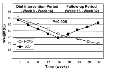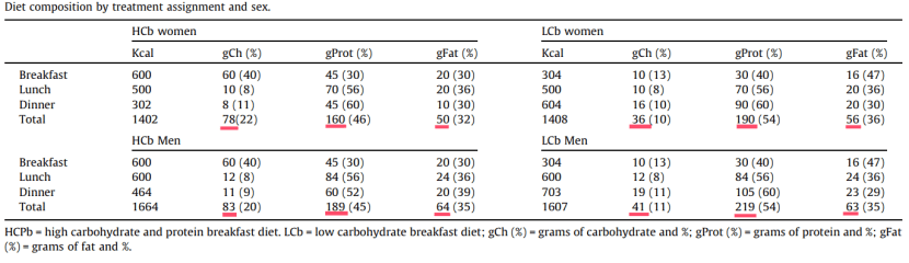 Dos dietas hipocalóricas (1500 kcal) bajas en carbohidratos ambas (11% y 21%). El grupo HCb (el que más carbohidratos consume de los dos) consume 80g/día de carbohidratos, pero los consume casi todos (60g) en el desayuno.