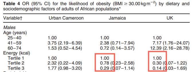 O visto de otra forma, cuantas más calorías consumes en Jamaica y UK, menor es el riesgo de padecer obesidad (luego aclaro esto último):