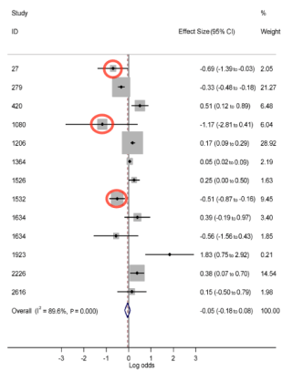 Los tres estudios que hemos visto antes son parte de este meta-análisis, en concreto son los que he marcado en la imagen con un círculo rojo.