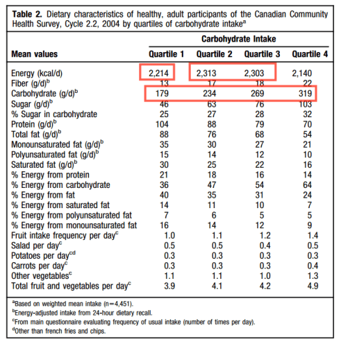 Insisto en que según los datos del estudio esas 100 kcal/d de diferencia entre grupos son 25 g/d menos de carbohidratos. Los delgados consumen más calorías y más carbohidratos. Si alguien pretende emplear este estudio para deducir que los obesos han engordado por consumir 25 g/d menos de carbohidratos cada día que los delgados, estaría diciendo que han engordado por consumir menos comida. Es el mismo dato.