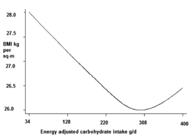 En este estudio, los que menos carbohidratos consumen son también los que menos calorías consumen y los que más peso corporal tienen.