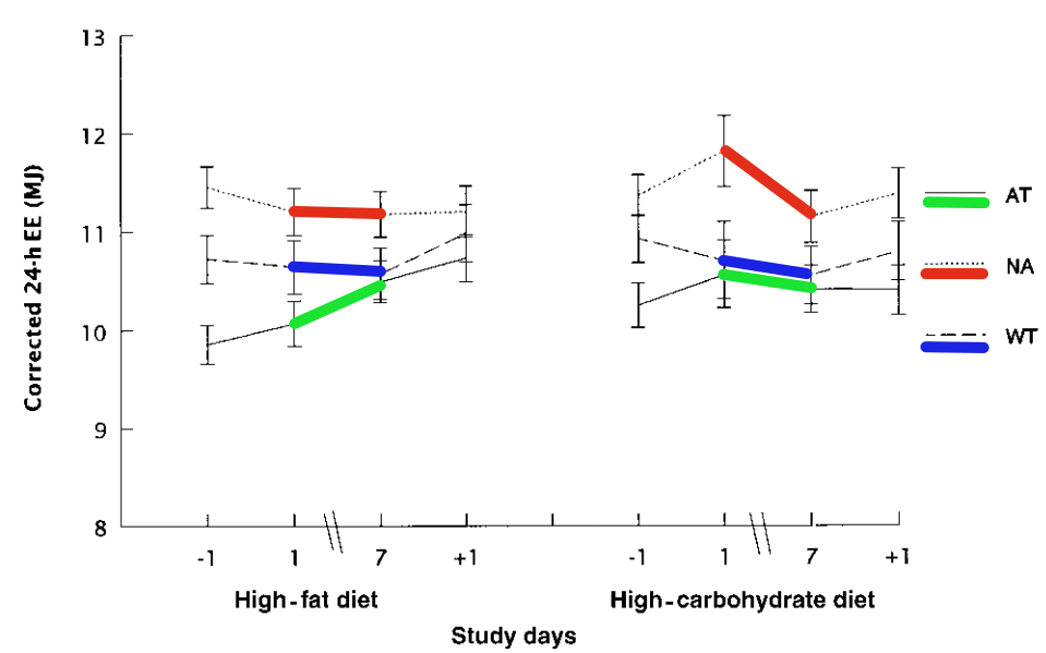 Este último dato es de tasa metabólica en reposo, no es el gasto energético total, y puede resultar engañoso, como ya hemos visto otras veces en el blog. En otro experimento («Substrate oxidation and energy expenditure in athletes and nonathletes consuming isoenergetic high- and low-fat diets«) se midió el gasto energético total en participantes que siguieron dos dietas diferentes, una alta en grasa (50%) y una alta en hidratos de carbono (65%). Los participantes se dividieron en tres grupos: AT, atletas, NA, no-atletas, y WT, los que practicaban ejercicio anaeróbico. Lo que se aprecia en la siguiente gráfica es que en todos los grupos la dieta alta en grasa mantuvo el gasto energético mejor o igual que la dieta alta en carbohidratos.