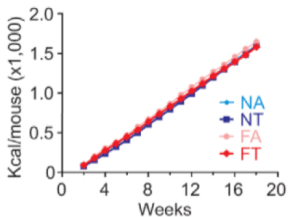 Los 4 grupos de ratones consumen la misma cantidad de calorías.