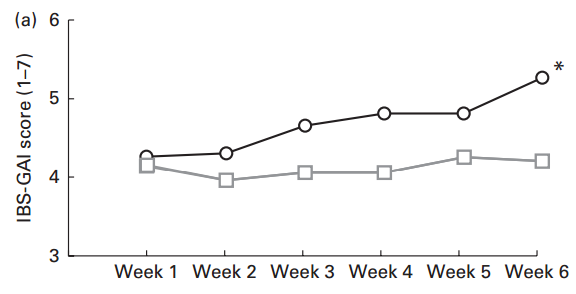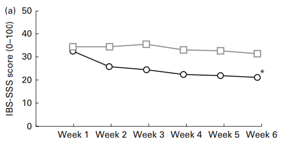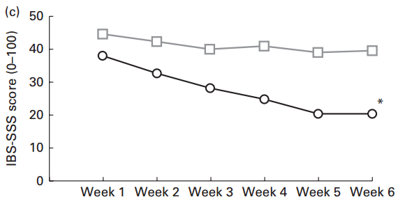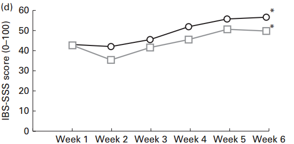 Las siguientes gráficas se han de interpretar de diferente forma. Muestran la intensidad de los síntomas (SSS) del síndrome de intestino irritable (IBS). Cuanto más alto el valor en la escala, peor:
