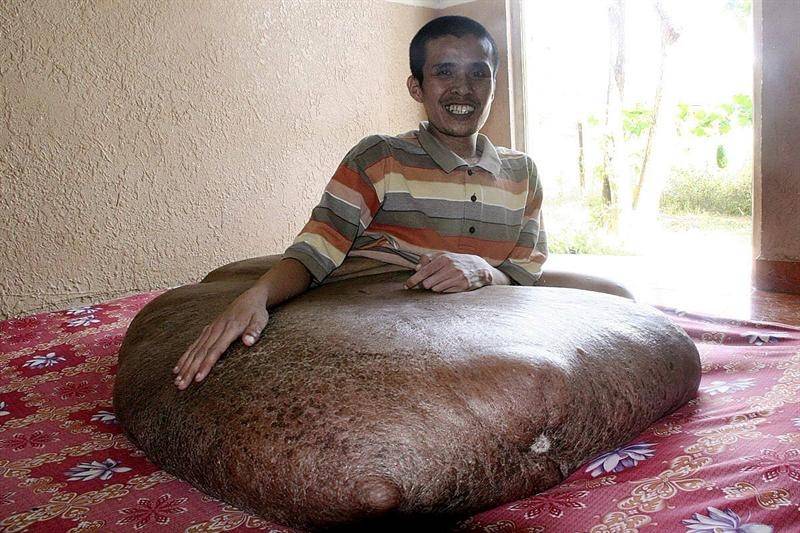 El señor de la foto tiene un tumor en la pierna que pesa 90 kg. En ese tumor se ha acumulado energía, ¿verdad? Y las leyes de la termodinámica son las mismas en este caso que en el caso de la obesidad. Ningún proceso biológico puede violar esas leyes.